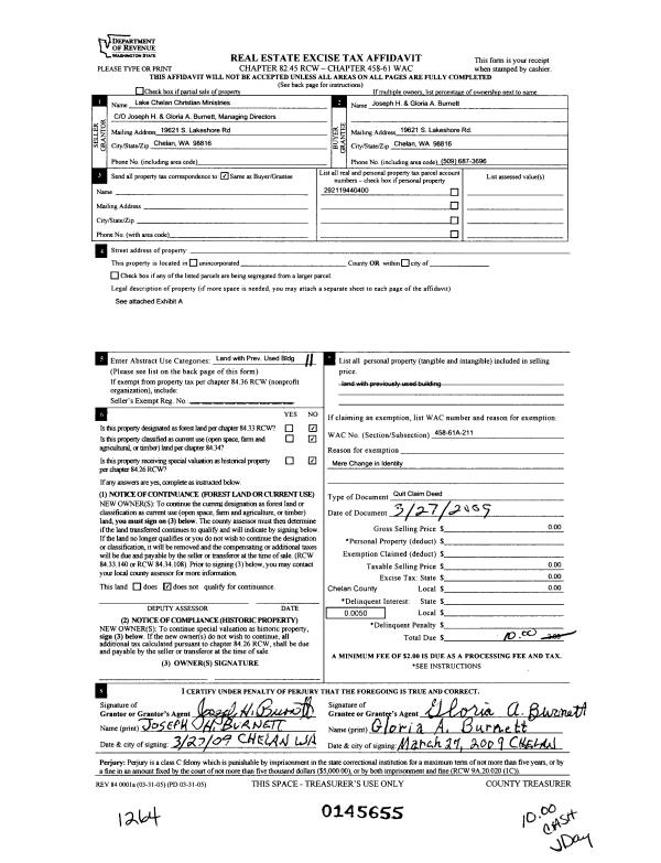 7 | 03/27/2009 | Q | Quit Claim Deed | LAKE CHELAN CHRISTIAN MINIST | BURNETT JOSEPH H & GLORIA A | | | $0.00 | 145655 | 2302185 |