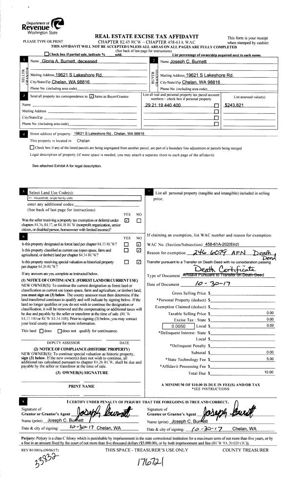 5 | 10/02/2017 | TOD | Transfer on Death **RECORD DOCUMENT w/ NO EXCISE | BURNETT GLORIA A | BURNETT JOSEPH C | | | | 0 | 2466079 |