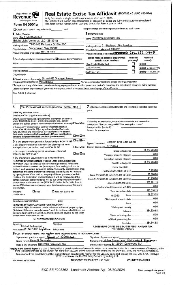 | 1 | 08/30/2024 | BARGAIN | Bargain & Sale Deed | BRIGHT LIGHT VENTURES LLC ETAL | WENATCHEE 625 REALTY LLC | | | $11,864,705.00 | 203362 | 2598457 |
