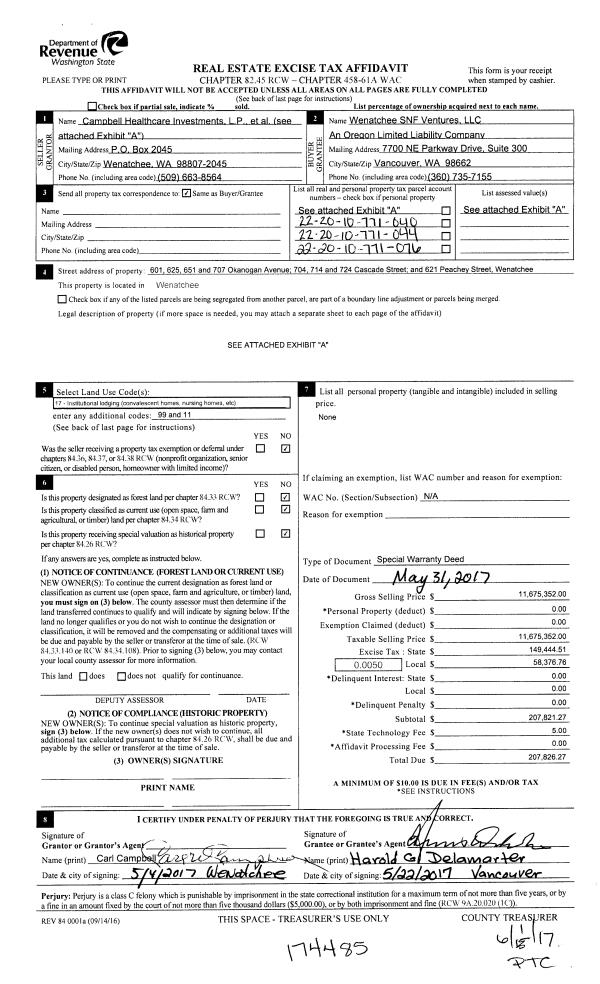 | 3 | 06/01/2017 | SP WD | Special Warranty Deed | CAMPBELL HEALTHCARE INVESTMENTS LP | WENATCHEE SNF VENTURES LLC | | | $11,675,352.00 | 174485 | 2458455 |