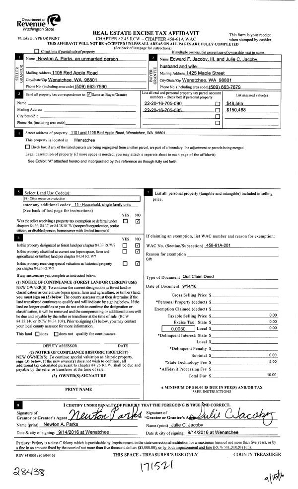| 5 | 09/15/2016 | Q | Quit Claim Deed | PARKS NEWTON A | JACOBY EDWARD F III & JULIE C | | | $0.00 | 171521 | 2444067 |