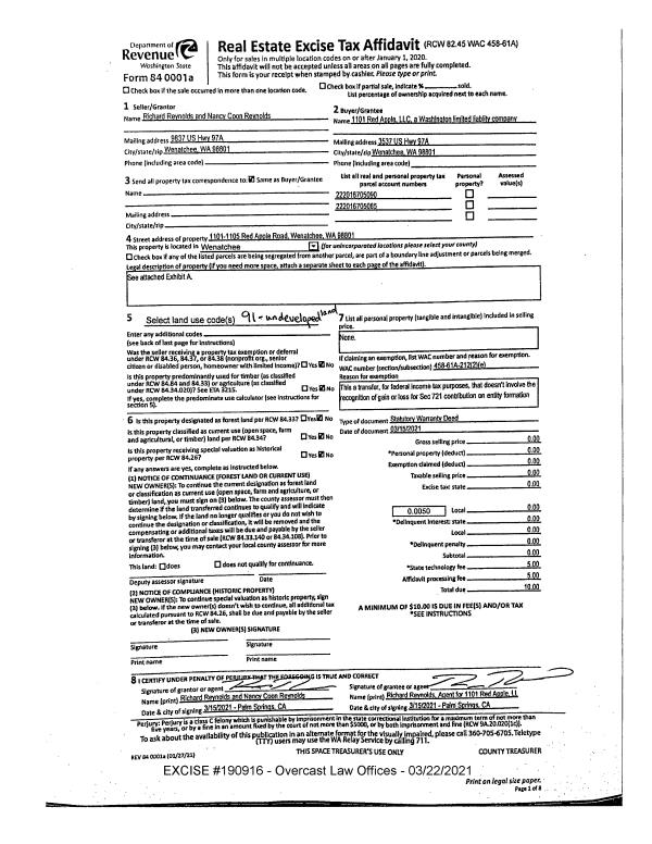| 2 | 03/22/2021 | SWD | Statutory Warranty Deed | REYNOLDS RICHARD & REYNOLDS NANCY C | 1101 RED APPLE LLC | | | $0.00 | 190916 | 2539512 |