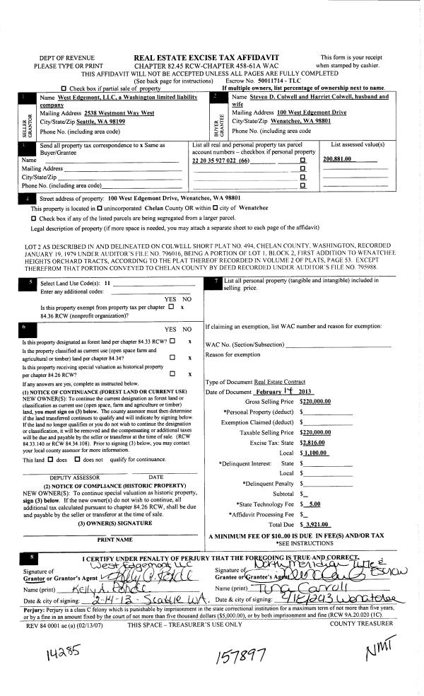 | 9 | 02/14/2013 | C | Real Estate Contract | WEST EDGEMONT LLC | COLWELL STEVEN D & HARRIET | | | $220,000.00 | 157897 | 2377205 |