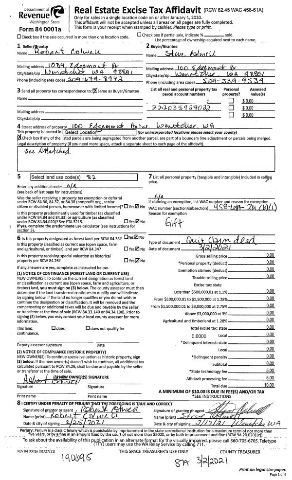 | 6 | 10/07/2021 | Q | Quit Claim Deed | COLWELL ROBERT W | COLWELL STEVEN D & HARRIET | | | | 193651 | 2554429BLA |