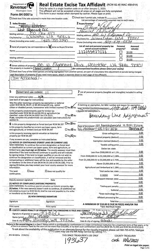 | 7 | 10/07/2021 | AMND REC | Amended Real Estate Contract | WEST EDGEMONT LLC | COLWELL STEVEN D & HARRIET | | | | 193637 | 2554427 BLA |
