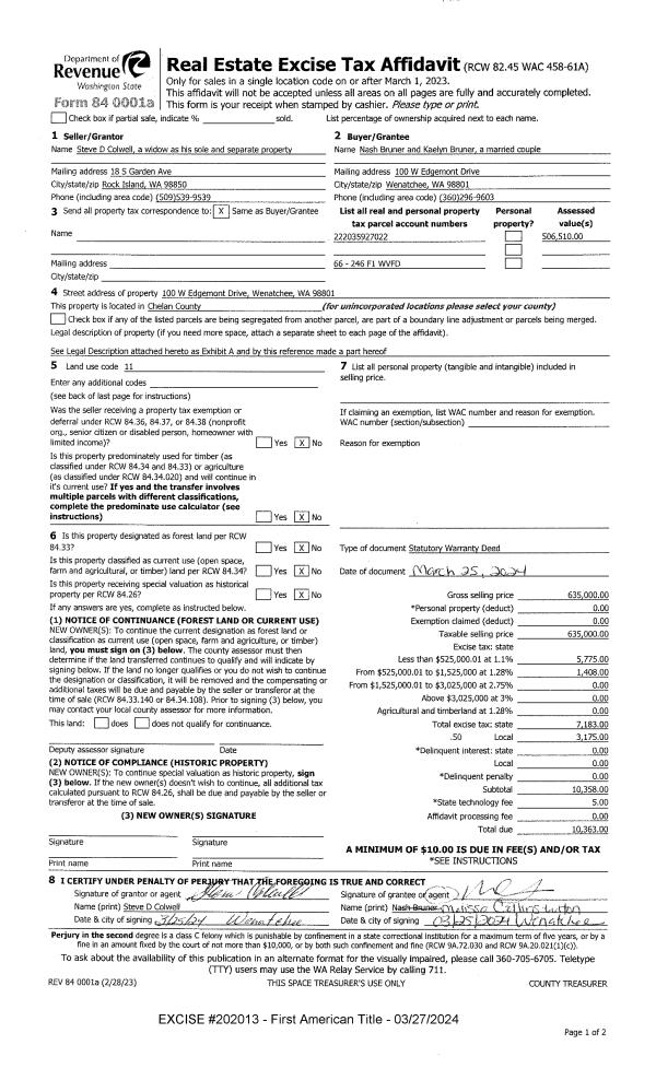 | 1 | 03/27/2024 | SWD | Statutory Warranty Deed | COLWELL STEVE | BRUNER NASH & KAELYN | | | $635,000.00 | 202013 | 2592533 |