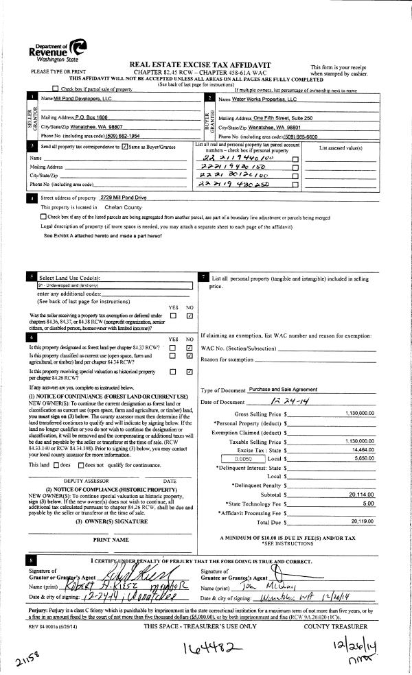 | 1 | 12/26/2014 | SWD | Statutory Warranty Deed | MILL POND DEVELOPERS LLC | WATER WORKS PROPERTIES LLC | | | $1,130,000.00 | 164482 | 2411333 |