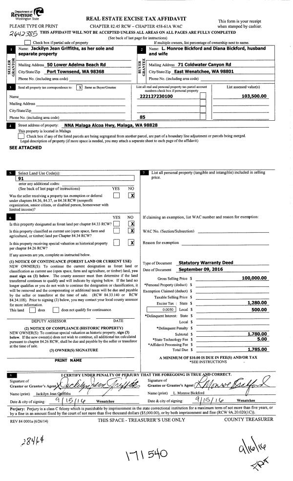 | 2 | 09/16/2016 | SWD | Statutory Warranty Deed | GRIFFITHS JACKILYN J | BICKFORD MONROE L & DIANA J | | | $100,000.00 | 171540 | 2444132 |