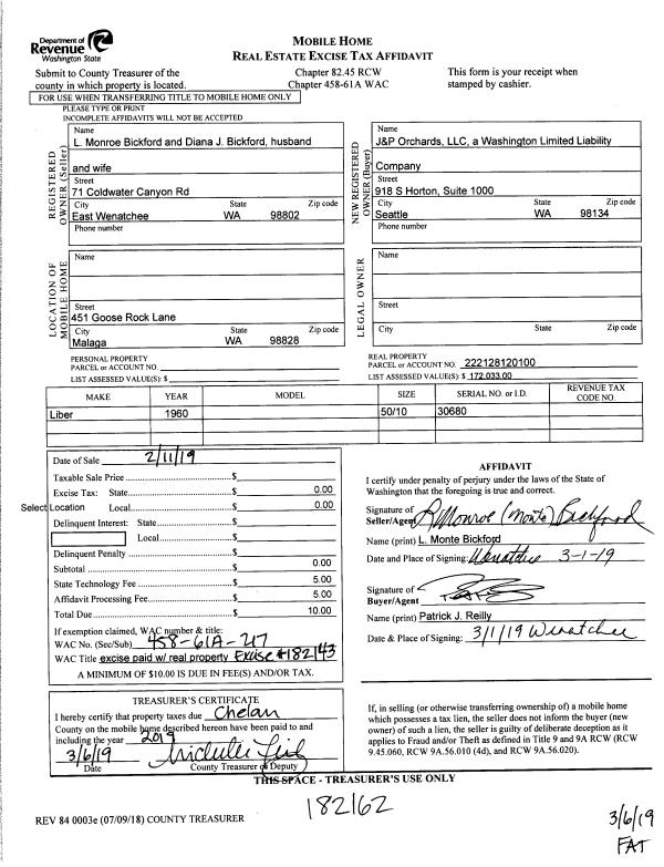 | 1 | 03/04/2019 | SWD | Statutory Warranty Deed | BICKFORD MONROE L & DIANA J | J & P ORCHARDS LLC | | | $844,300.00 | 182143 | 2492656 |