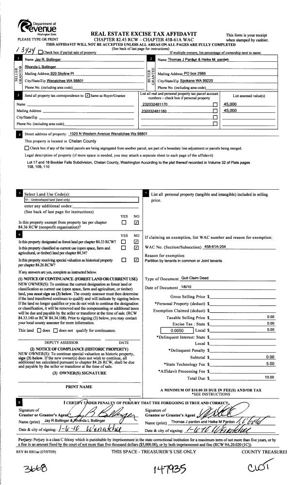 | 6 | 01/06/2010 | Q | Quit Claim Deed | PARDUN THOMAS J & HEIKE M | PARDUN THOMAS J & HEIKE M | | | $0.00 | 147935 | 2317313 |