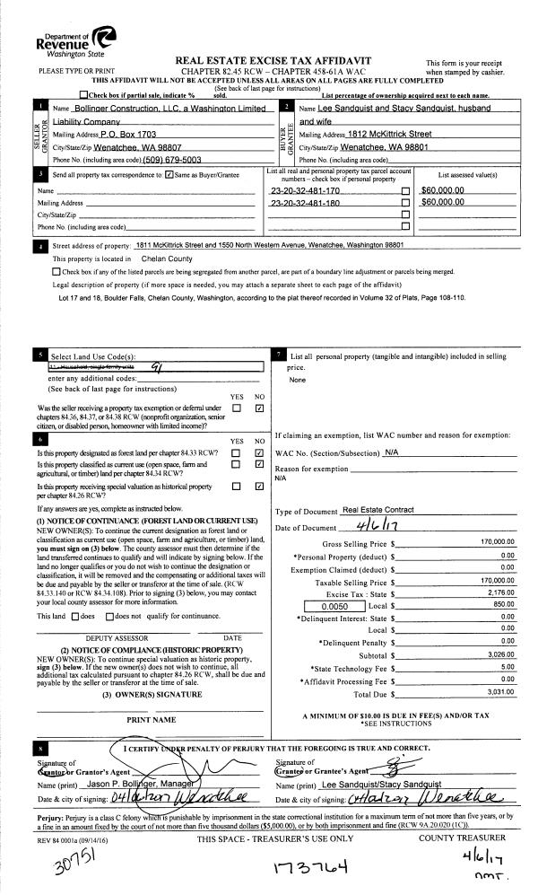 | 4 | 04/06/2017 | C | Real Estate Contract | BOLLINGER CONSTRUCTION LLC | SANDQUIST LEE J & STACY | | | $170,000.00 | 173764 | 2455403 |
