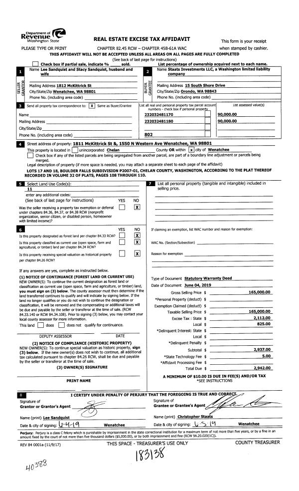 | 2 | 06/06/2019 | SWD | Statutory Warranty Deed | SANDQUIST LEE J & STACY | STAATS INVESTMENTS LLC | | | $165,000.00 | 183138 | 2497109 |