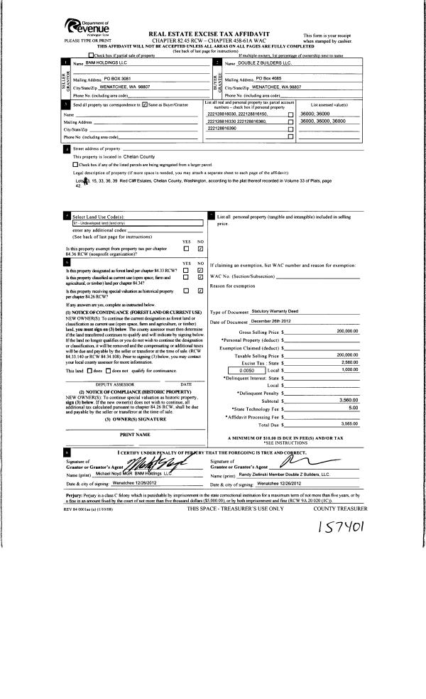 | 6 | 12/28/2012 | SWD | Statutory Warranty Deed | BNM HOLDINGS LLC | DOUBLE Z BUILDERS LLC | | | $200,000.00 | 157401 | 2374213 |