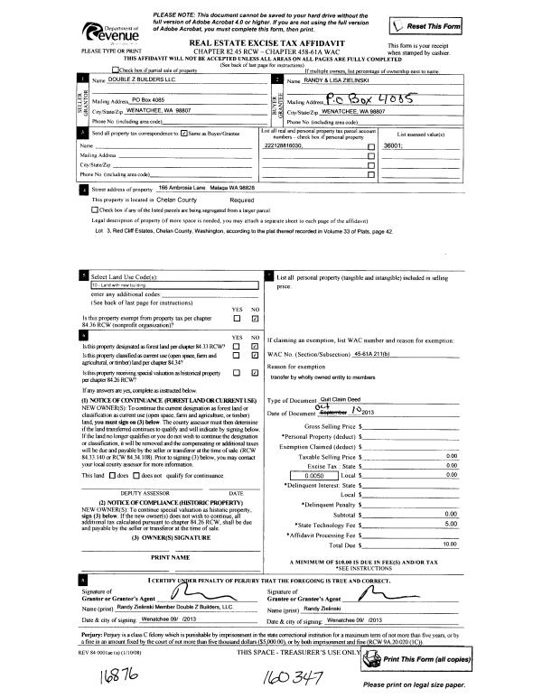 | 5 | 10/10/2013 | Q | Quit Claim Deed | DOUBLE Z BUILDERS LLC | ZIELINSKI RANDY & LISA | | | $0.00 | 160347 | 2391249 |