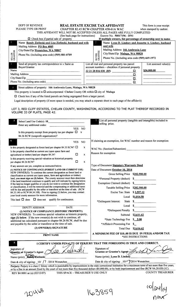 | 4 | 10/24/2014 | SWD | Statutory Warranty Deed | ZIELINSKI RANDY & LISA | LINDSEY LYNN D & JEANETTE A | | | $202,900.00 | 163859 | 2408132 |