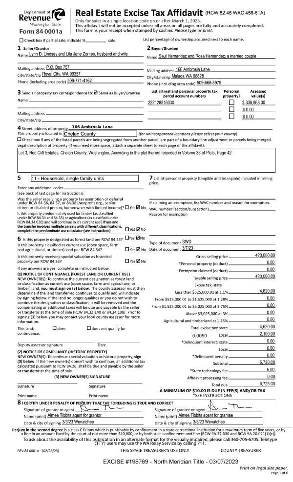 | 1 | 03/07/2023 | SWD | Statutory Warranty Deed | LINDSEY LYNN D & ZORNES LILA J | HERNANDEZ SAUL & ROSA | | | $420,000.00 | 198769 | 2579193 |