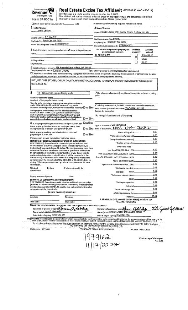 | 2 | 11/17/2022 | Q | Quit Claim Deed | LINDSEY LYNN D | LINDSEY LYNN D & ZORNES LILA J | | | $0.00 | 197962 | 2575871 |