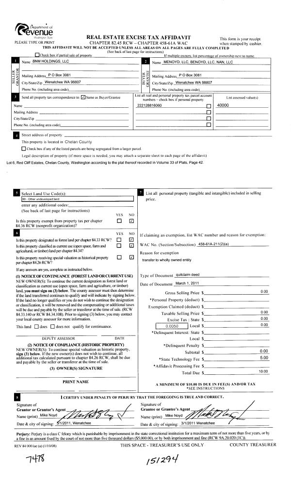 | 2 | 03/02/2011 | Q | Quit Claim Deed | BNM HOLDINGS LLC | MENOYD LLC NAN LLC & BENOYD LLC | | | $0.00 | 151294 | 2339318 |
