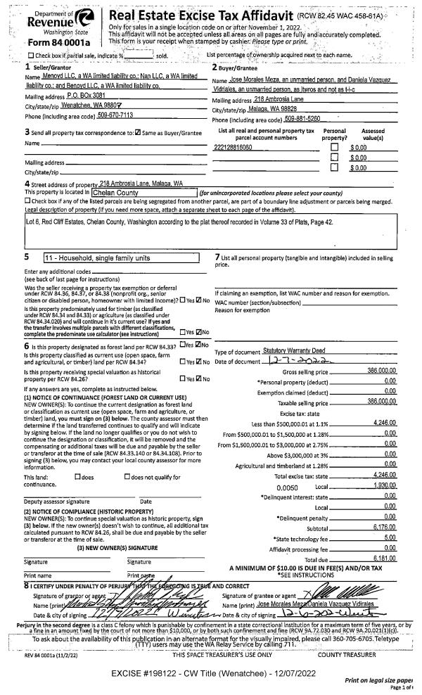 | 1 | 12/07/2022 | SWD | Statutory Warranty Deed | MENOYD LLC NAN LLC & BENOYD LLC | MORALES MEZA JOSE & VAZQUEZ VIDRIALES DANIELA | | | $386,000.00 | 198122 | 2576552 |