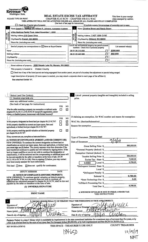 1 | 10/15/2019 | W | Warranty Deed | NORTHRUP FAMILY TRUST | BROWN CHRISTINE & RANDY | | | $550,000.00 | 184650 | 2503687 |