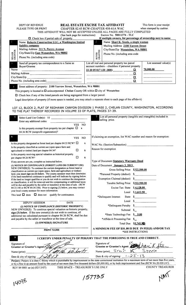 | 4 | 01/30/2013 | SWD | Statutory Warranty Deed | ROBERTS CONSTRUCTION LLC | STEELE SHARI K | | | $322,500.00 | 157735 | 2376016 |
