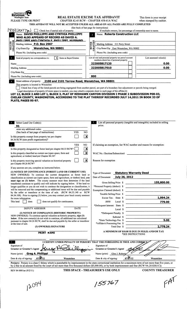 | 5 | 07/31/2012 | SWD | Statutory Warranty Deed | PHILLIPPI DAVID ETAL | ROBERTS CONSTRUCTION LLC | | | $155,800.00 | 155767 | 2365123 |