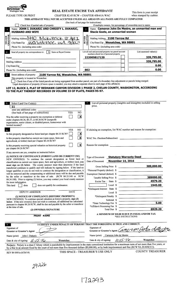 | 2 | 11/16/2016 | SWD | Statutory Warranty Deed | DUKARIC JOHN I & CHRISTY L | DE MESTRE CAMERON J ETAL | | | $389,000.00 | 172293 | 2447988 |