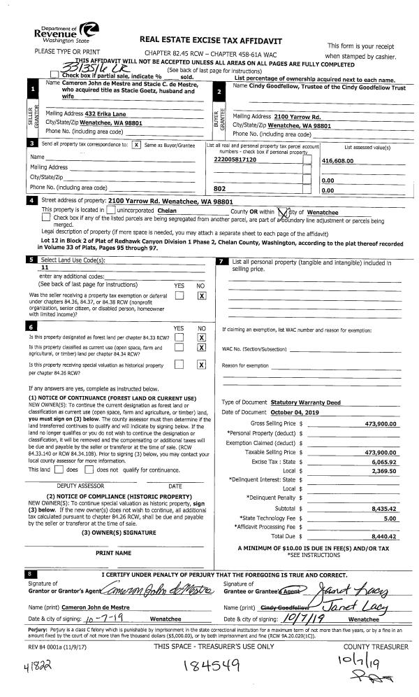 | 1 | 10/07/2019 | SWD | Statutory Warranty Deed | DE MESTRE CAMERON J ETAL | CINDY GOODFELLOW TRUST | | | $473,900.00 | 184549 | 2503862 |