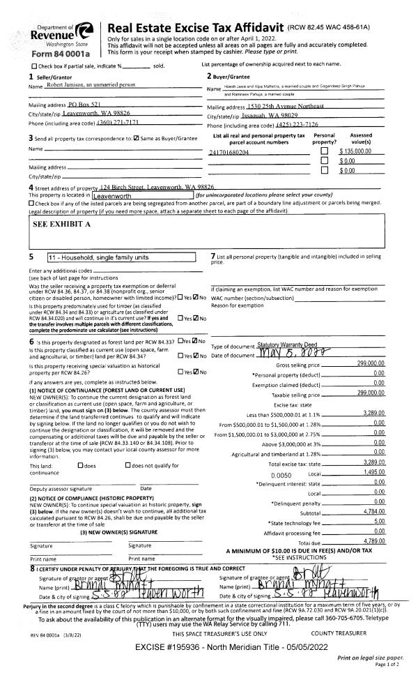 | 1 | 05/05/2022 | SWD | Statutory Warranty Deed | JAMISON ROBERT T | JAWA HITESH & MALHOTRA ALPA ETAL | | | $299,000.00 | 195936 | 2566691 |