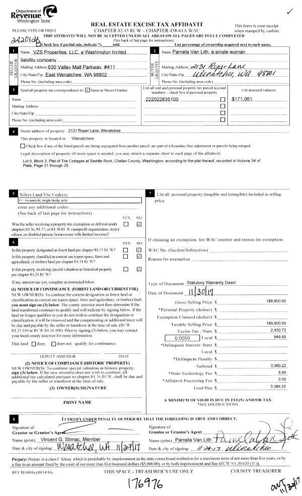 | 3 | 11/30/2017 | SWD | Statutory Warranty Deed | VZS PROPERTIES LLC | VAN LITH PAMELA | | | $189,900.00 | 176976 | 2469576 |