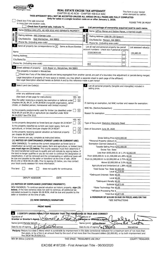 | 2 | 06/30/2020 | SWD | Statutory Warranty Deed | VAN LITH PAMELA | MANAS JEFFREY & DEBBIE | | | $242,000.00 | 187206 | 2518806 |