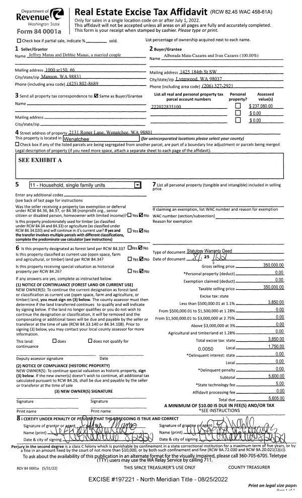 | 1 | 08/25/2022 | SWD | Statutory Warranty Deed | MANAS JEFFREY & DEBBIE | CAZARES IVAN M & ALBORADA MATA CAZARES | | | $350,000.00 | 197221 | 25724444 |