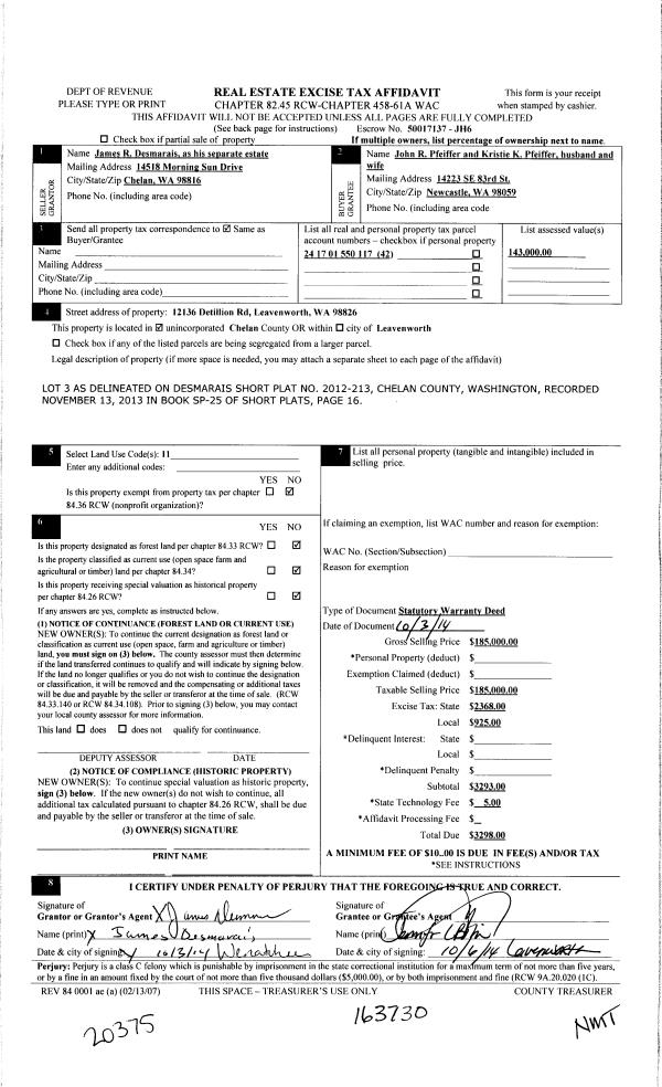 | 3 | 10/10/2014 | SWD | Statutory Warranty Deed | DESMARAIS JAMES R | PFEIFFER JOHN R & KRISTIE K | | | $185,000.00 | 163730 | 2407528 |