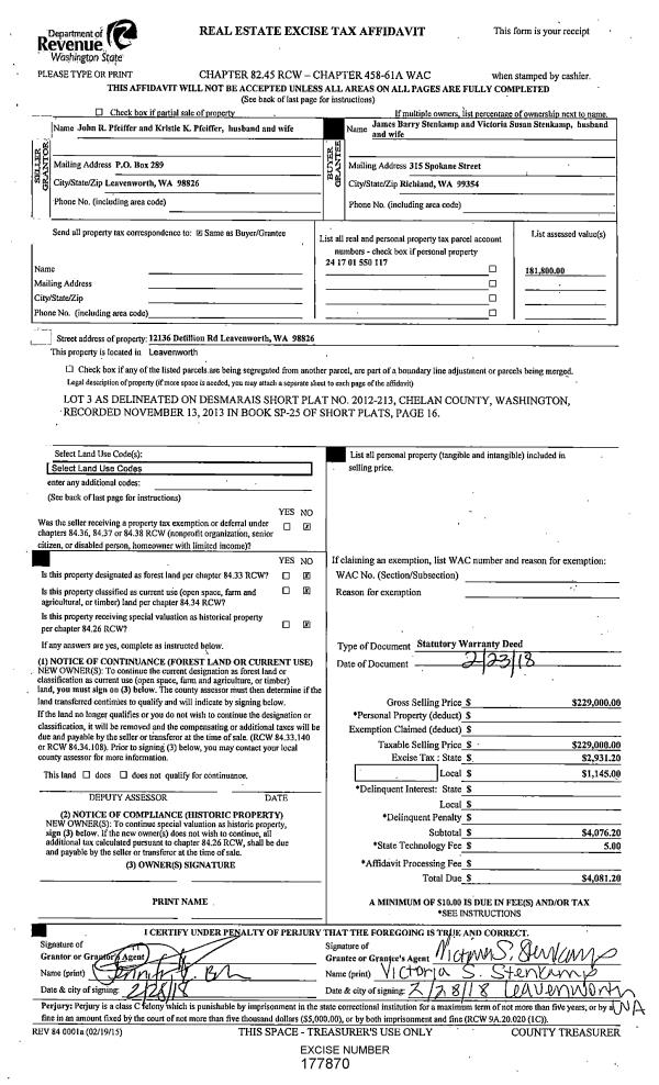 | 2 | 03/01/2018 | SWD | Statutory Warranty Deed | PFEIFFER JOHN R & KRISTIE K | STENKAMP JAMES B & VICTORIA S | | | $229,000.00 | 177870 | 2473787 |