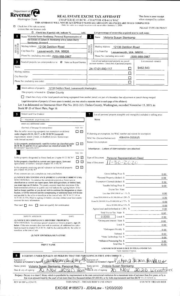 | 1 | 12/03/2020 | PR | Personal Representatives Deed | STENKAMP JAMES B ESTATE | STENKAMP VICTORIA S | | | $0.00 | 189573 | 2530983 |