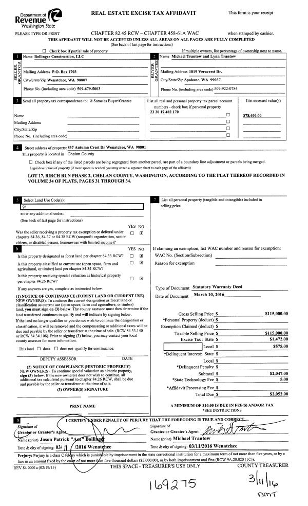1 | 03/11/2016 | SWD | Statutory Warranty Deed | BOLLINGER CONSTRUCTION LLC | TRANTOW MICHAEL & LYNN | | | $115,000.00 | 169275 | 2433689 |