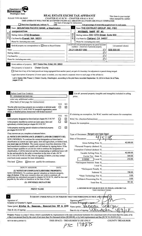 | 1 | 04/09/2018 | BARGAIN | Bargain & Sale Deed | MOUNTAIN PACIFIC BANK | THE ENTRUST GROUP INC FBO MICHAEL DART ETAL | | | $42,500.00 | 178275 | 2475745 |