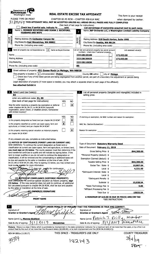 | 1 | 03/04/2019 | SWD | Statutory Warranty Deed | BICKFORD MONROE L & DIANA J | J & P ORCHARDS LLC | | | $844,300.00 | 182143 | 2492656 |