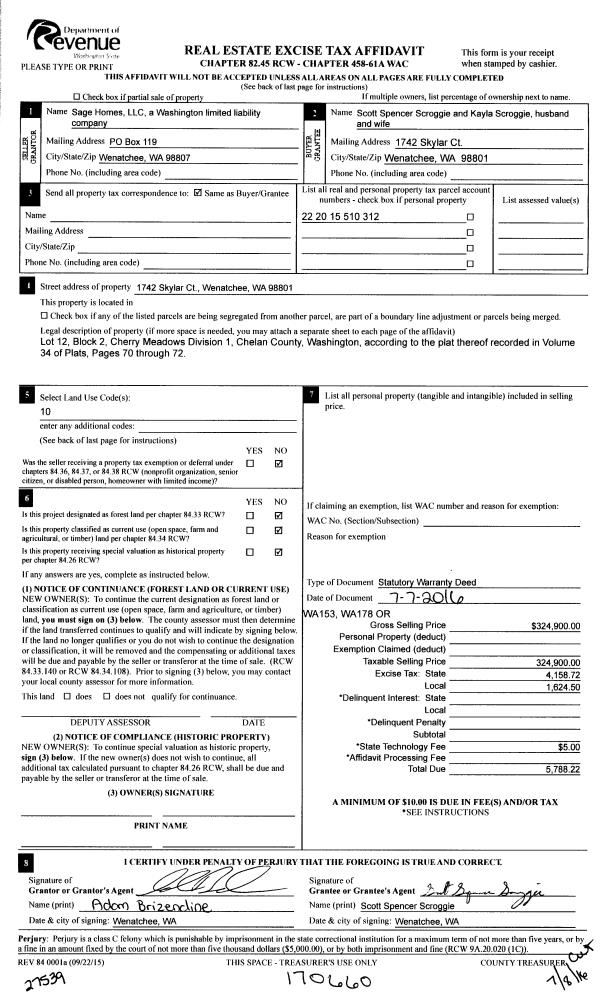 | 4 | 07/08/2016 | SWD | Statutory Warranty Deed | SAGE HOMES LLC | SCROGGIE SCOTT S & KAYLA | | | $324,900.00 | 170660 | 2440015 |