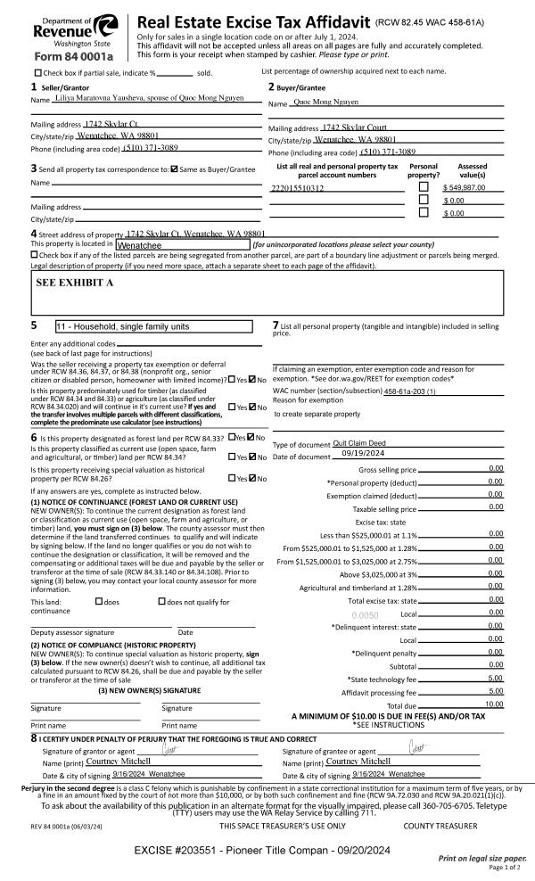 | 1 | 09/20/2024 | Q | Quit Claim Deed | YAUSHEVA LILIYA M | NGUYEN QUOC M | | | $0.00 | 203551 | 2599227 |