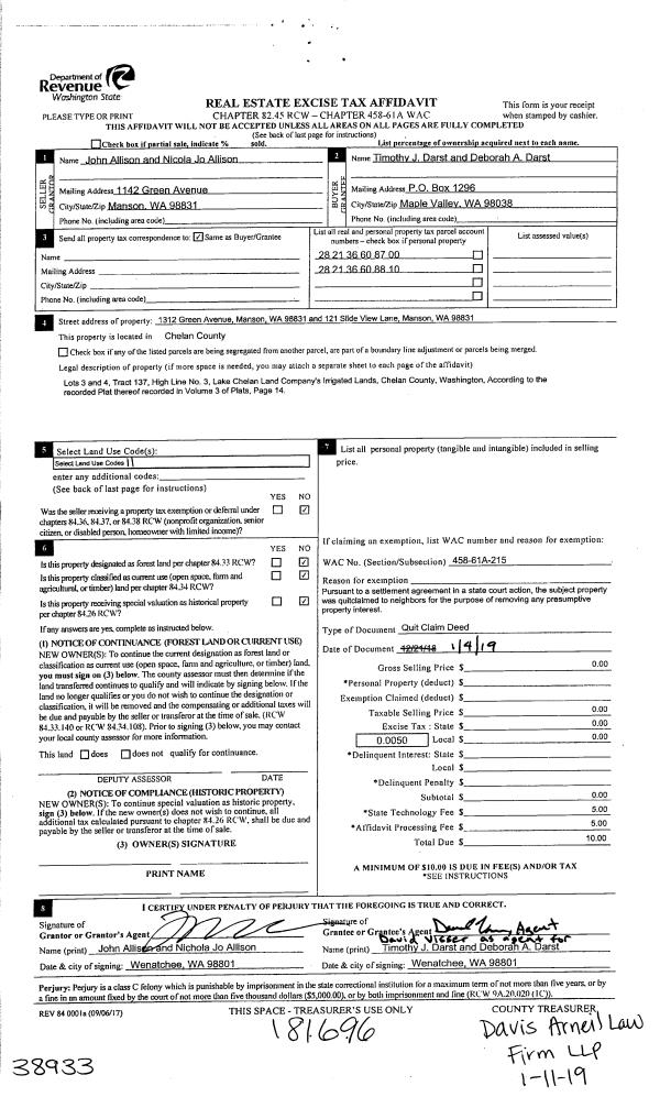 | 3 | 01/29/2019 | Q | Quit Claim Deed | ALLISON JOHN & NICOLA | DARST TIMOTHY J & DEBORAH A | | | | 0 | 2490538 |