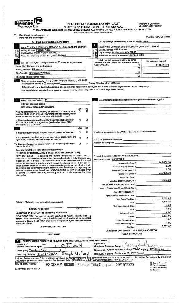 | 1 | 09/15/2020 | SWD | Statutory Warranty Deed | DARST TIMOTHY J & DEBORAH A | DAVIDSON HOLLY & IAN | | | $242,000.00 | 188369 | 2524675 |