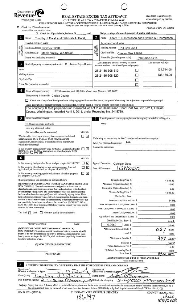| 2 | 03/19/2020 | Q | Quit Claim Deed | DARST TIMOTHY J & DEBORAH A | RASMUSSEN ADAM T & CYNTHIA A | | | $4,983.00 | 186197 | 2512827 BLA |