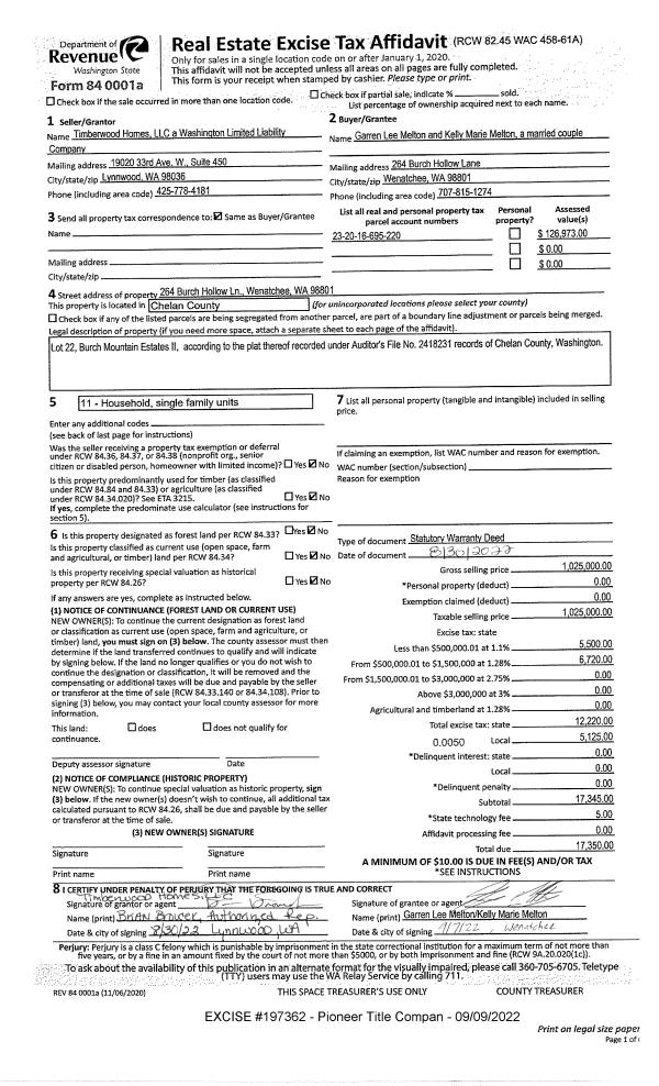 | 1 | 09/09/2022 | SWD | Statutory Warranty Deed | TIMBERWOOD HOMES LLC | MELTON GARREN L & KELLY M |  |  | $1,025,000.00 | 197362 | 2573102 |