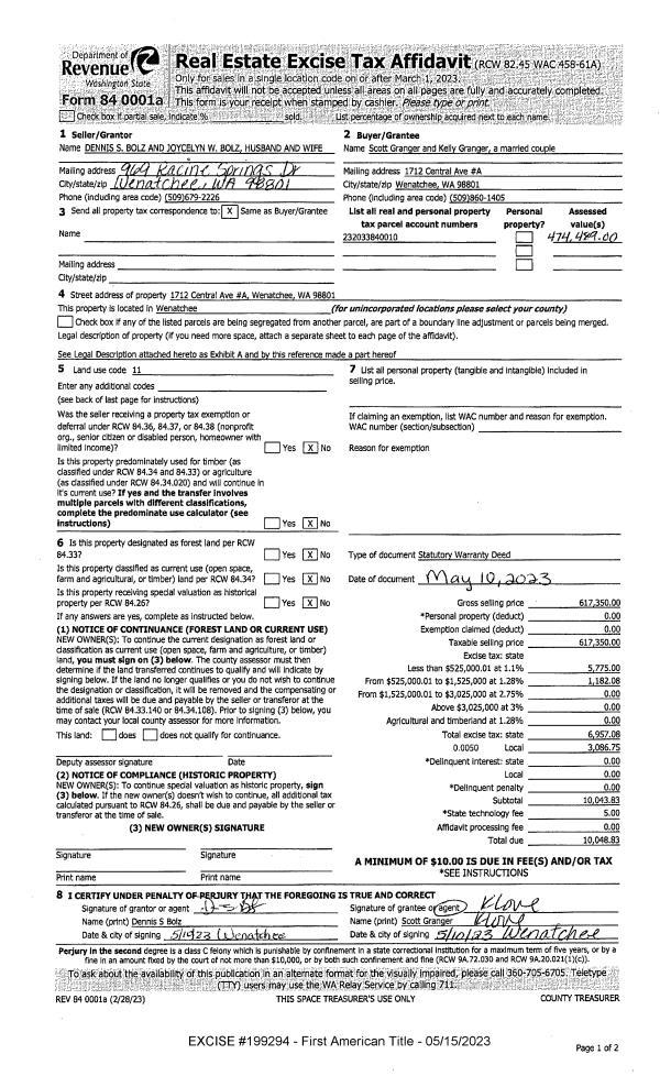 | 1 | 05/15/2023 | SWD | Statutory Warranty Deed | BOLZ DENNIS S & JOYCELYN W | GRANGER SCOTT & KELLY | | | $617,350.00 | 199294 | 2581378 |