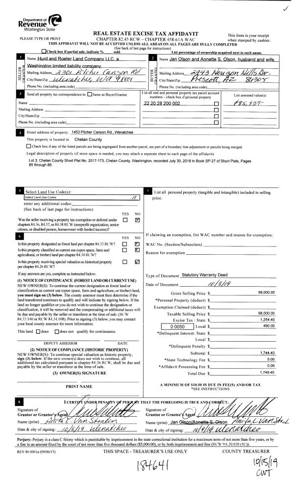 5 | 10/15/2019 | SWD | Statutory Warranty Deed | HURD AND ROETER LAND COMPANY LLC | OLSON JAN & ANNETTE S | | | $98,000.00 | 184641 | 2504339 |