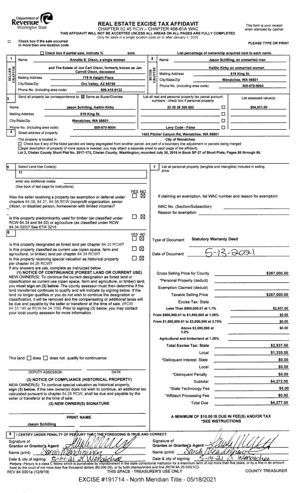 3 | 05/18/2021 | SWD | Statutory Warranty Deed | OLSON JAN & ANNETTE S | SCHILLING JASON & KIRBY KAITLIN | | | $267,000.00 | 191714 | 2544186 |
