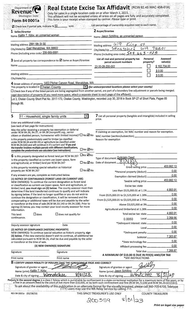 1 | 08/31/2023 | Q | Quit Claim Deed | KIRBY KAITLIN T & SCHILLING JASON | SCHILLING JASON W | | | $453,992.00 | 200359 | 2585713 |