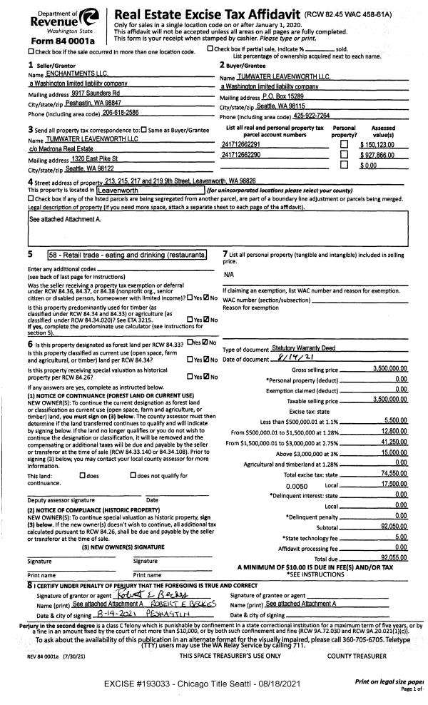 | 1 | 08/18/2021 | SWD | Statutory Warranty Deed | ENCHANTMENTS LLC | TUMWATER LEAVENWORTH LLC | | | $3,500,000.00 | 193033 | 2551030 |