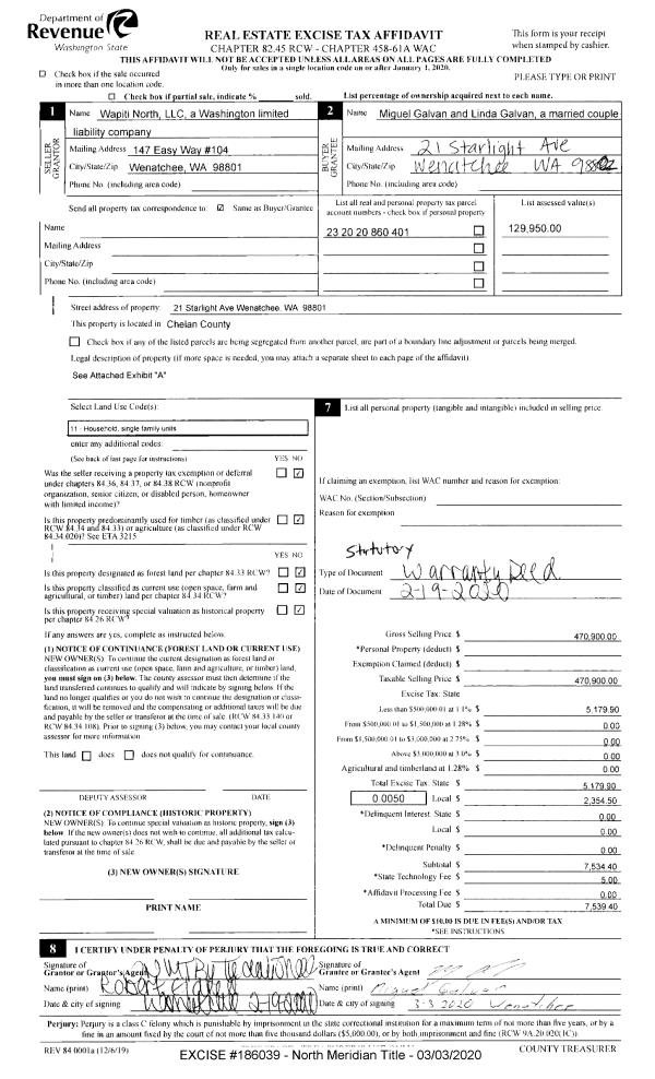 | 1 | 03/03/2020 | SWD | Statutory Warranty Deed | WAPITI NORTH LLC | GALVAN MIGUEL & LINDA | | | $470,900.00 | 186039 | 2512027 |